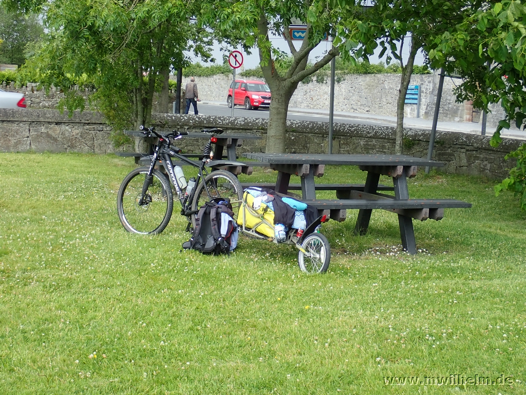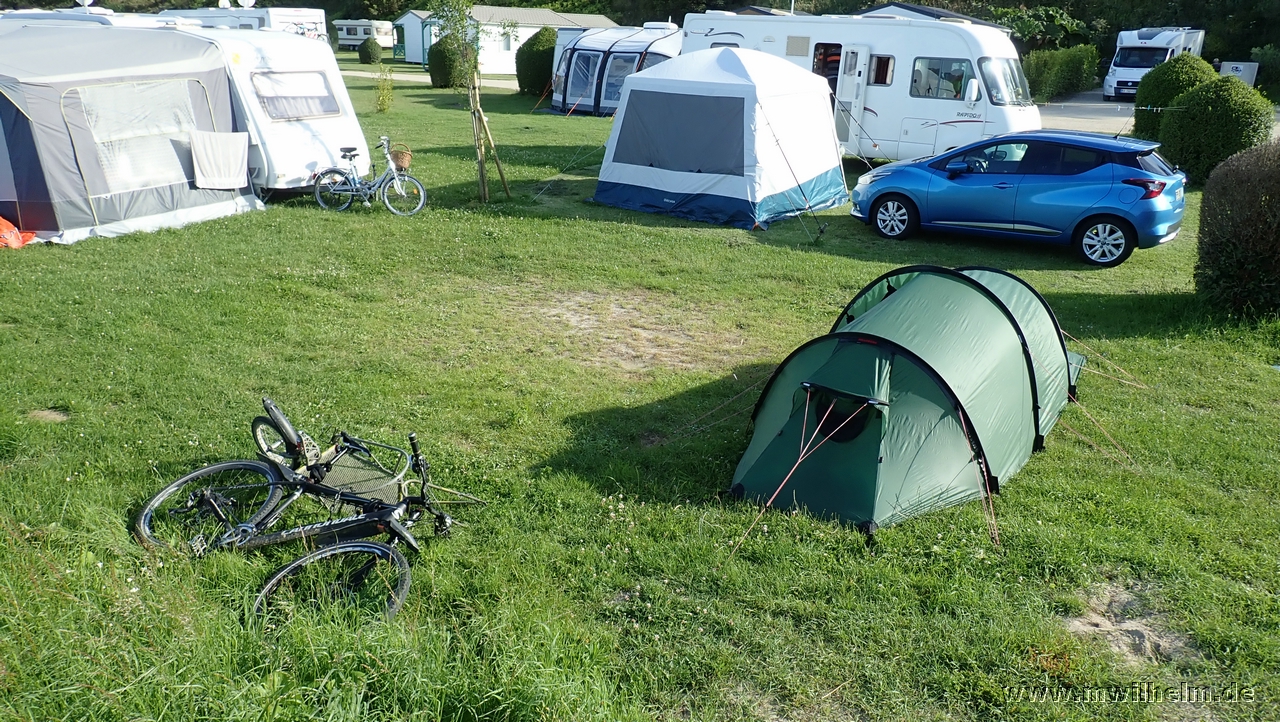 Nun ja. Dann beginnt eben das Übliche. Sanitäter kommen, kümmern sich um mich und die Frau. Nachdem bei mir alles gut ist, legen sie den Schwerpunkt auf die Frau und laden diese schließlich ins Fahrzeug. Die Gendarmerie rückt auch an und nimmt die Personalien auf. Ich bekomme die Adresse von der Frau. Wortlos taucht wenig später noch der Ehemann der Frau auf, packt das Fahrrad auf den Träger an seinem Auto, spricht mit der Gendarmerie. Ich bitte einen der Leute der Gendarmerie der Dame gute Besserung zu wünschen. Dann sind alle wieder weg und ich kann mein Fahrrad wieder fahrtüchtig machen und zur Unterkunft fahren. Zum Glück ist das nicht mehr weit. Die Radfahrer, die mir mit ihren elektrischen Fahrrädern entgegenkommen oder die ich überhole beobachte ich schon mit sehr großem Misstrauen. Besonders dann, wenn die Leute darauf hocken, wie King Käse. Als gibt es sonst niemand Anderen auf der Welt. In der Unterkunft dusche ich, reinige und versorge meine Wunden.
