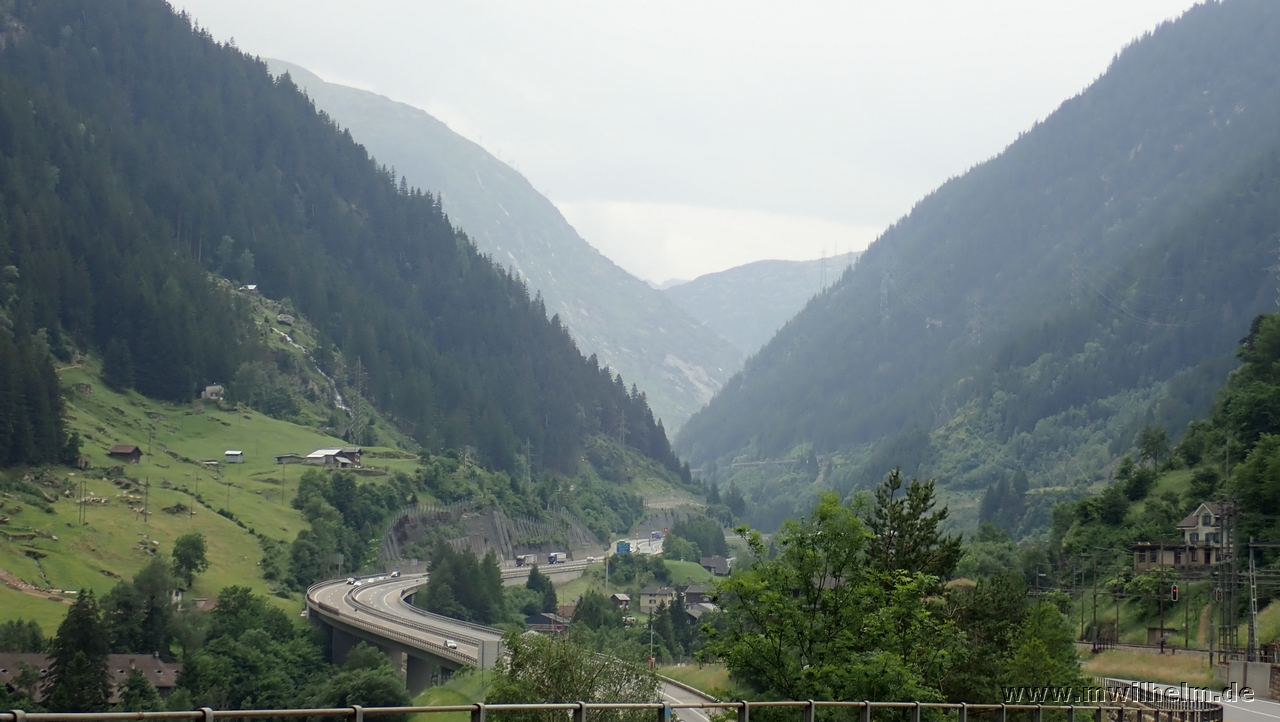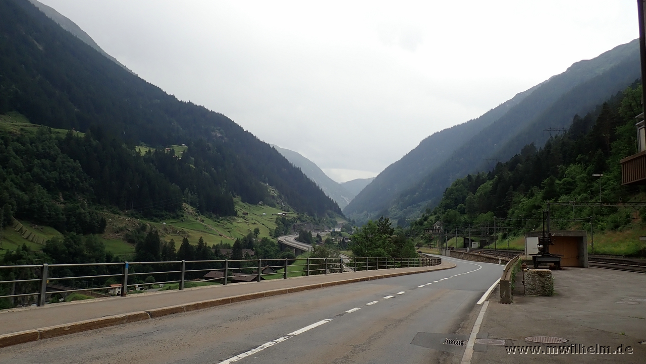 Nachdem ich die kleine Gemeinde Intragana passiert habe, beginnt die schwere Arbeit. Die Route verläuft sehr steil bergauf. Allerdings auch durch eine extrem beeindruckende Natur! Die Schmalspurbahn, die ich immer wieder über- oder unterquere, fasziniert mich ebenfalls. Eine Meisterleistung an Planung und Bauhandwerk. Die Berge ringsum ragen sehr steil in die Höhe, immer wieder überqueren kleine Material Seilbahnen das Tal. Wohin diese allerdings führen, verliert sich meist in den dichten Wolken. Denn das Wetter hat sich massiv geändert. Die Hitze ist weg und dafür fahre ich schon den ganzen Tag über im Regen. Am frühen Nachmittag erreiche ich die Grenze zu Italien.