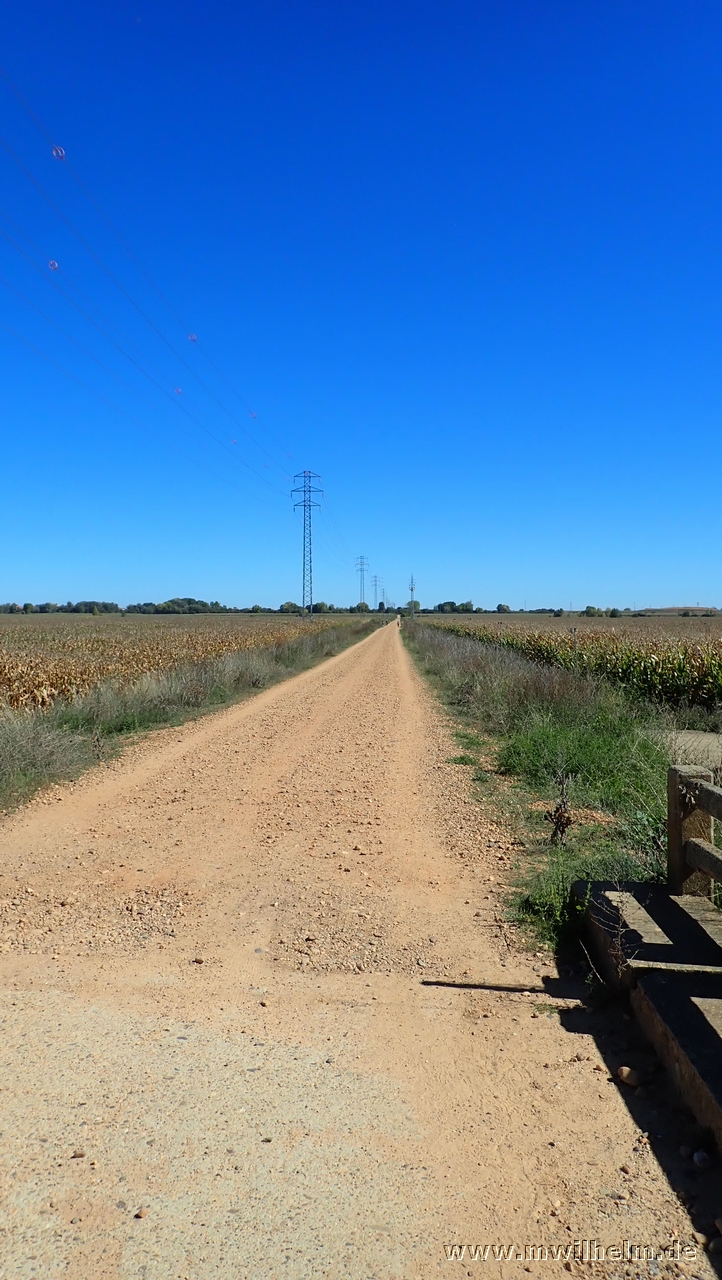 Die Radwege in Spanien sind leider nicht so luxuriös wie die Supermärkte. Es sind eigentlich alles Pisten aus Sand und Schotter. Asphalt gibt es quasi nicht. Der Sand ist fast weiß und je höher die Sonne steht umso heller blendet der Sand. Außerdem staubt es gewaltig. Selbst ich mit dem Fahrrad wirble schon einigen Staub auf. Ganz zu schweigen, falls ein Auto oder gar ein Lkw entgegenkommt, oder überholt. Da bleibe ich gerne freiwillig stehen, bis sich der Staub gelegt hat. Inzwischen ist es auch richtig heiß geworden. Ich bin froh, dass ich 4,5 Liter Wasser dabeihabe. Ich komme an zahlreichen und beinahe endlosen Flächen für Ackerbau und Plantagen für Obst vorbei. Fast überall stehen Pumpen am Weg und pumpen Wasser auf die Felder oder in die Plantagen. Wo es kein Wasser gibt, herrscht Dürre. Viele Felder sind schon gemäht worden. Dort wo bewässert werden kann wurde bereits wieder frisch gesät.