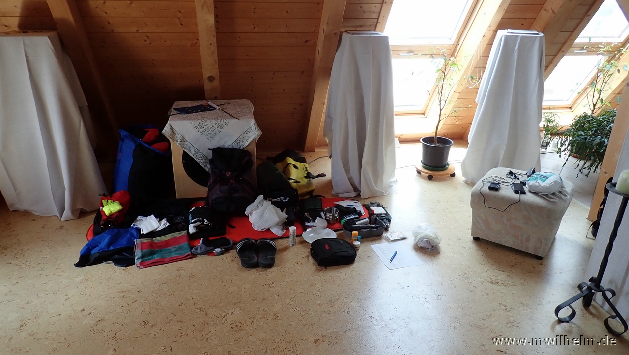 Das Gepäck für die Reise stelle ich anhand der Packlisten der letzten Radreisen zusammen. Inzwischen kenne ich die wichtigsten Punkte meiner Packliste auswendig. Alles kommt zunächst auf einen großen Haufen, wird nochmal geprüft und dann in den Taschen für den Gepäckträger verpackt. Fertig.
