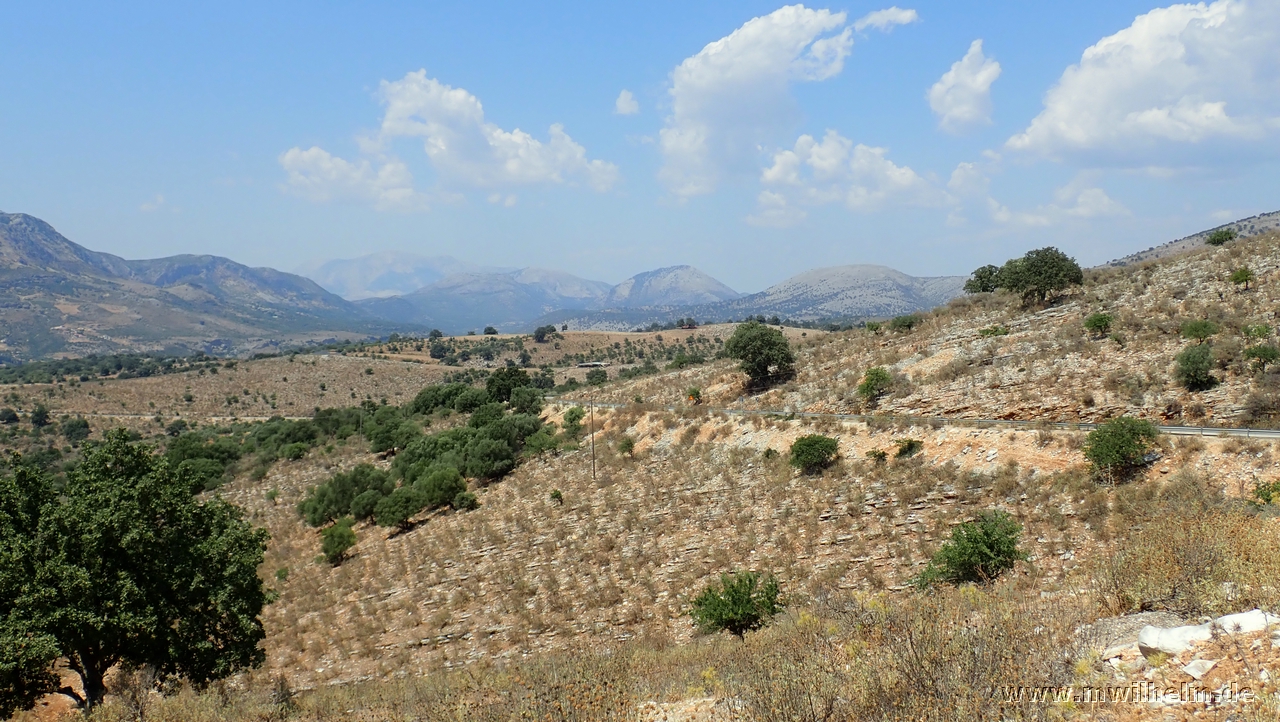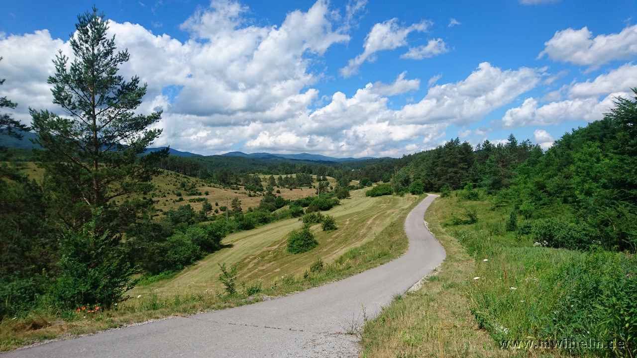 Auch für den morgendlichen Ablauf gibt es inzwischen so etwas wie Routine: Zähne putzen, mit Sonnenschutz einschmieren, Radlerklamotten anziehen, Wasserflaschen füllen und einpacken, Gepäck schnappen, Zimmer bezahlen und los. Heute ist die Etappe wirklich ein Genuss zu fahren: Ich fahre auf einer kleinen Straße ohne Verkehr, es gibt teilweise Schatten aber vor allem unglaublich schöne Ausrichten über die Berge und Täler. Fast hinter jeder Kurve könnte ich anhalten und Bilder machen. Es ist einfach sehr beeindruckend. Die meisten der Eindrücke werde ich (hoffentlich) lange in Erinnerung haben. Der Weg führt durch viele kleine Dörfer in den Bergen. Sehr romantisch! Doch es ist nicht zu übersehen, dass die Unwetter auch hier für Schäden sorgen.