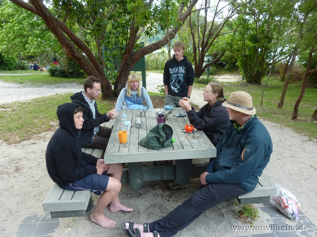 Auf der nächsten Etappe müssen wir uns auch sehr an einen strengen Zeitplan halten: Der Zeitplan von Ebbe und Flut. Denn auch hier müssen wir wieder ein paar Stellen durchqueren, die nur bei Ebbe passierbar sind. Am Morgen hat es auch noch angefangen zu regnen. Erst nur wenig, aber schon bald regnet es Bindfäden. Am Nachmittag erreichen wir nach dem „Tidal-Crossing“ das Tagesziel: Eine Hütte des DOC. Eigentlich hatten wir für diese Nacht ebenfalls nur einen Zeltplatz gebucht, aber während unserer heutigen Regen-Etappe ist in uns der Wunsch nach einem Bett in einer Hütte immer stärker geworden. Als wir ankommen ist die Hütte wirklich brechend voll. Es stellt sich jedoch schnell heraus, dass fast alle Leute dort heute noch weiter müssen. Wir könnten also Glück haben mit einem trockenen Bett.