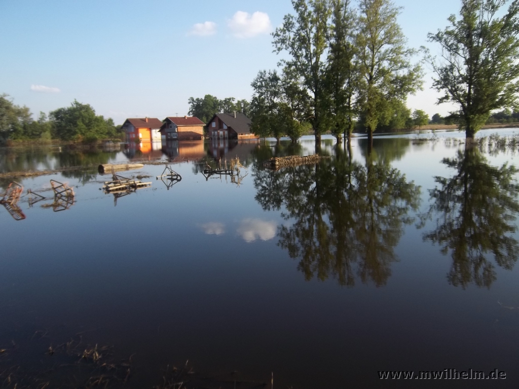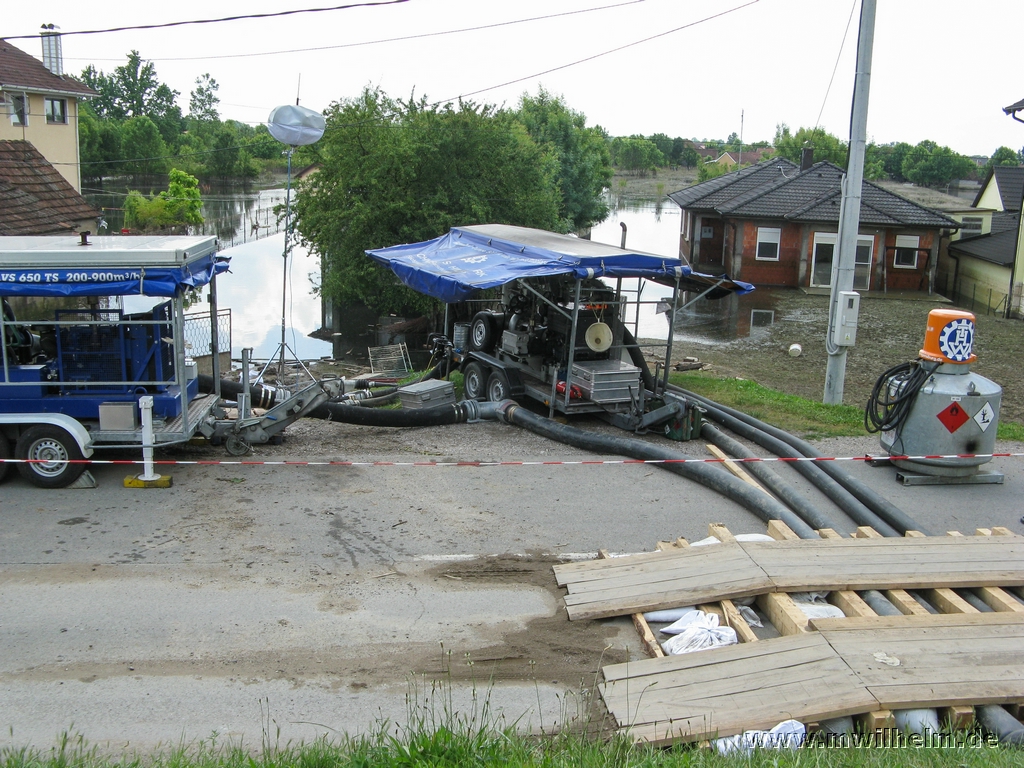 Als wir im Schadensgebiet eintreffen wird das Ausmaß der Überflutungen sichtbar. Ich bin ziemlich überrascht, wie weitläufig die Überflutungen sind. Hier werden wir sehr lange pumpen müssen. Das Land ist sehr flach. Und das Wasser hat sich über große Flächen verteilt. Es werden wohl an einigen Stellen die Deiche zur Save geöffnet, damit das Hochwasser schneller in die Save zurück fließen kann. Aber deren Wasserstand muss eben auch erst mal noch etwas weiter fallen.