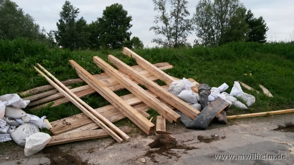 Die Straße an der wir stehen ist die einzige Verbindung der nächsten Ortschaft zu Außenwelt. Alle Fahrzeuge müssen hier vorbei, rein und raus. Das ist bei den LKWs ein Problem. Die machen die Holzrampen durch das extreme Gewicht schnell kaputt. Damit hatten wir heute in der Hauptsache unseren Spaß. Immer wieder mussten wir gebrochene Bretter tauschen. Den Unterbau haben auch zu optimieren versucht. Wir waren grade fertig damit, als ein Sattelzug zu weit rechts auf der Rampe fuhr. Der rutschte runter und hing dann an der Rampe fest. Nach einigem Unterbauen konnte der LKW dann wieder rückwärts raus fahren und es nochmal mit der Überfahrt versuchen. Danach war dann die Rampe leider am Ende. Wir haben die Rampe zwar nochmals gerichtet, aber eigentlich war sie hinüber. Gegen Mittag kam dann Arbeiter vom Bauhof auf einem Roller daher mit Brettern unterm Arm und einer Motorsäge in Korb auf dem Gepäckträger. Er hat dann zusammen mit ein paar anderen Leuten die Rampe wieder gerichtet. Wir hatten leider außer Pumpen nicht wirklich viel anderes Gerät dabei.
