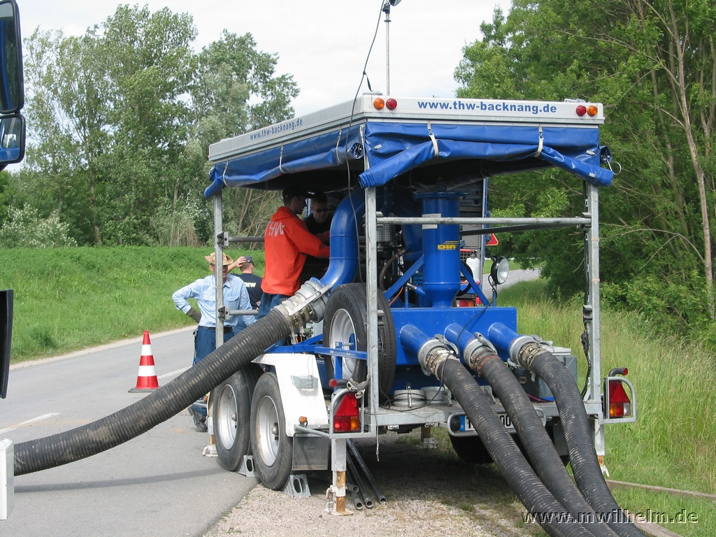 Zuerst alle paar Tage, dann aber immer häufiger müssen wir die Pumpen umsetzen, damit die Saugkörbe keine Luft ziehen. Eigentlich ist das keine sehr anstrengende Arbeit. Aber durch unsere Arbeit am Wasser haben wir die Mücken aufgescheucht und die sind über uns hergefallen. Ganze Schwärme!! Die gelben Reflex-Streifen der THW-Kleidung waren fast schwarz.